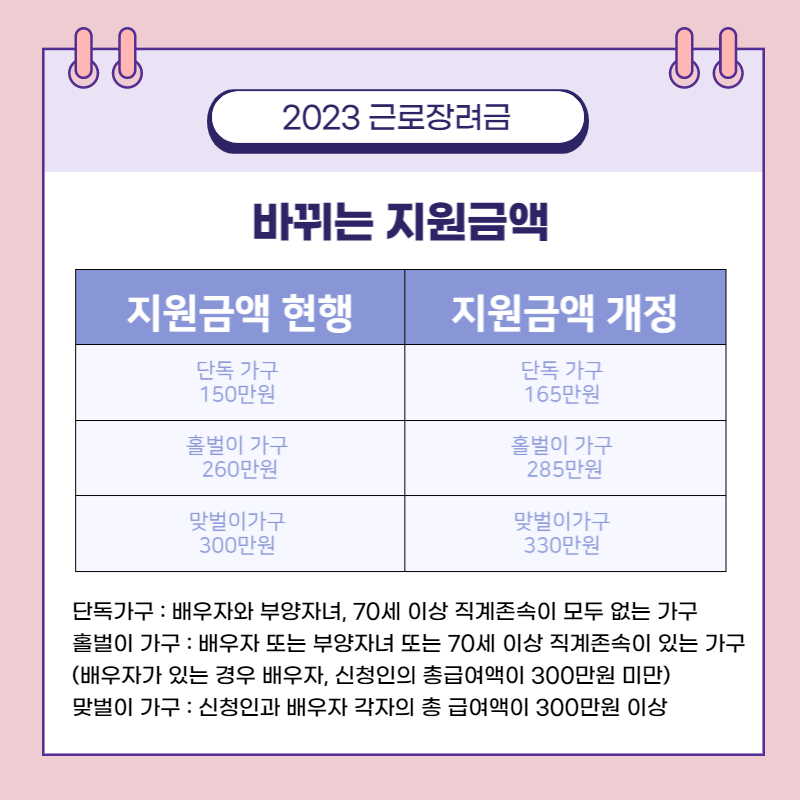 오늘은 정부지원제도 중 하나인 근로장려금에 대해 알아보겠습니다 3월 1일부터 하반기분 신청이 시작되었으며 기존 재산 요건을 일부완화하고 근로장려금의 경우 작년대비 10% 인상되어 최대 330만 원을 받을 수 있다고 합니다 올해부터는 조금 더 완화된 조건으로 많은 분들이 혜택을 보실 수 있을 거라 예상됩니다 그럼 지금부터 알아보기 쉽게 핵심만 정리 한 2023 근로장려금 신청자격 지급일 신청방법까지 알아보도록 하겠습니다